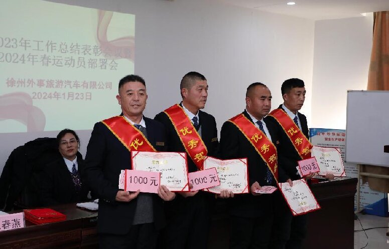 关注微信公众号1月23日,徐州外事旅游汽车有限公司2023年度工作总结表彰大会暨2024年春运动员会议在庄严的国歌声中拉开帷幕。公司领导班子,全体机关人员,一线人员代表和获得荣誉的先进个人近80人参加会议。公司董事长刘晓梅,总经理杜红军分别讲话,副总经理沈春燕作年度工作总结,总经理助理刘金忠作春运工作动员。会议由党支部副书记兼工会主席袁作芳主持。
